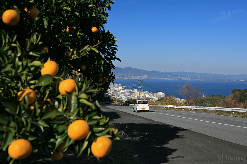 別府市側国道10号線から入って暫くの狭い道を抜けると広い二車線道路に出る。少し走ると視界が開けて車窓から海を眺める事が出来る。