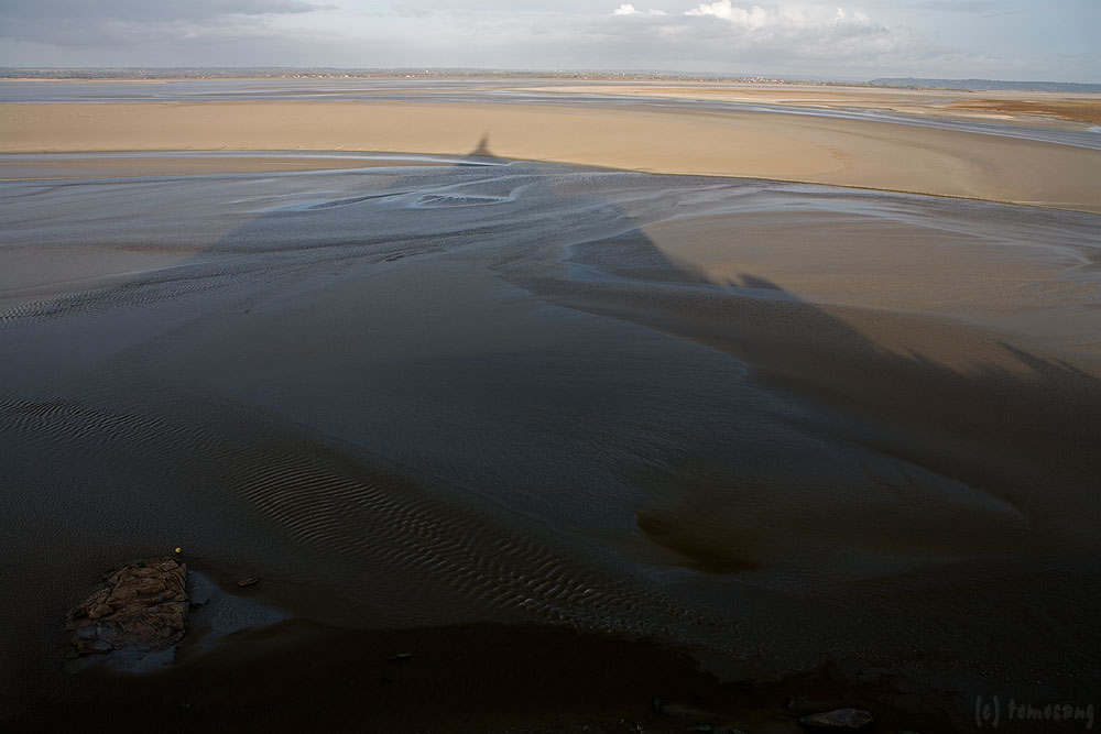 干潟にモン・サン・ミシェルの影が。
