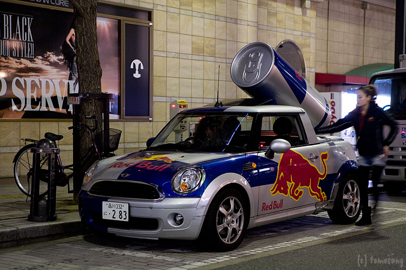 ドリンクのサンプリング中でした。横にはミニクーパー改Red Bull mini!