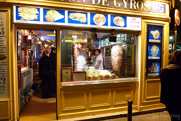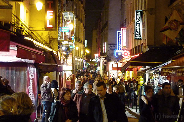 ホテルまではメトロで戻るので、Saint-Michel駅を目指して川沿いを歩く。サンミッシェル広場から地下へと下ろうとしたら賑やかな通りに気が付く。セーヌ川と並行して走る、一区画奥の通り。グーグルアース調べによると【Rue de la Huchette / ユシェット通り】と表示されている。なんだか楽しそうなので突入してみた。