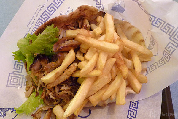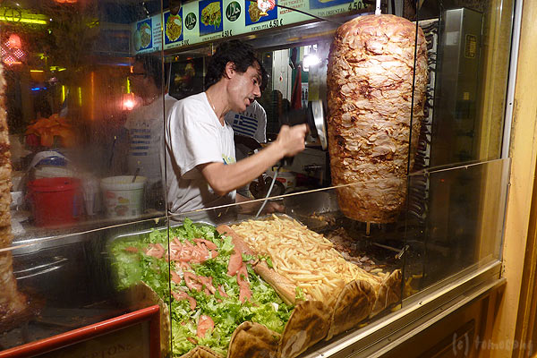 大きな肉の塊を回転させながら電熱器で焼き上げている。焼けた表面を電動カンナみたいなのでそぎ落とし、フライドポテトとサラダを一緒にサンドイッチ。