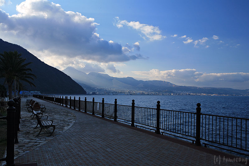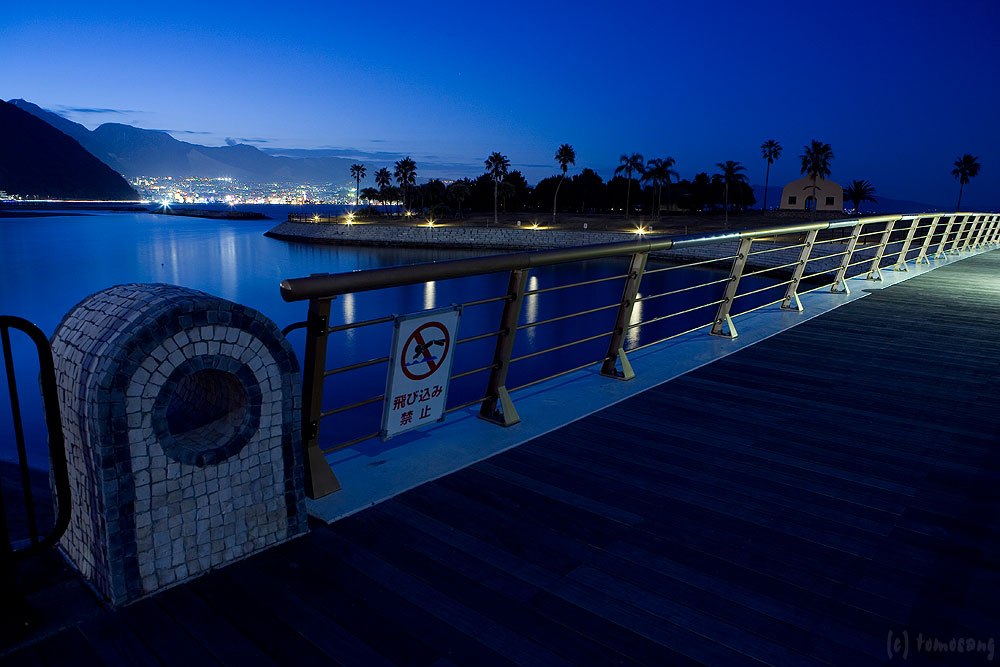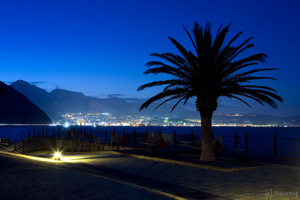 人工島を海側まで行くとデッキになっていて、別府湾と別府市街をベンチに座って眺める事が出来る。