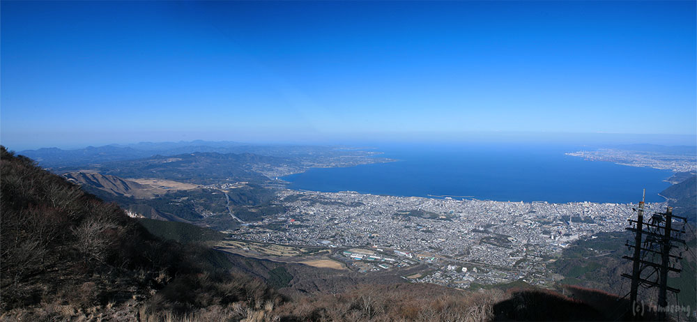 駅屋上から市街地・別府湾の眺め。3枚パノラマ合成