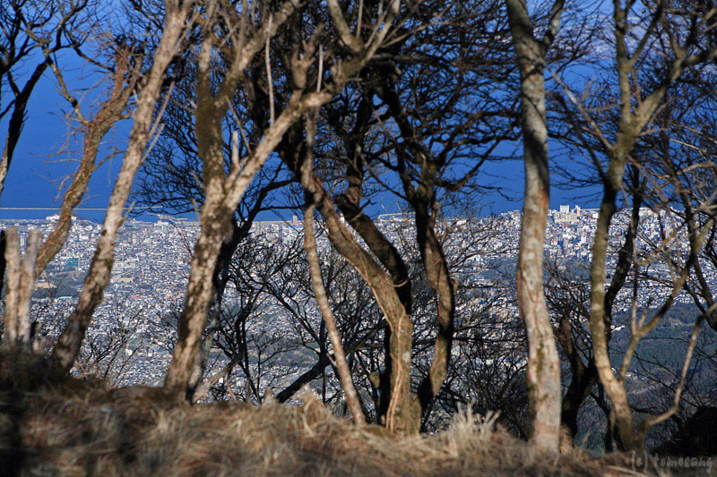 遊歩道を歩いていると、木々の間から下界の町並みが見え隠れする。