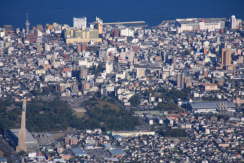 別府市街アップで。左手前にビーコンタワー、その上に別府公園、さらに海沿いに別府タワー
