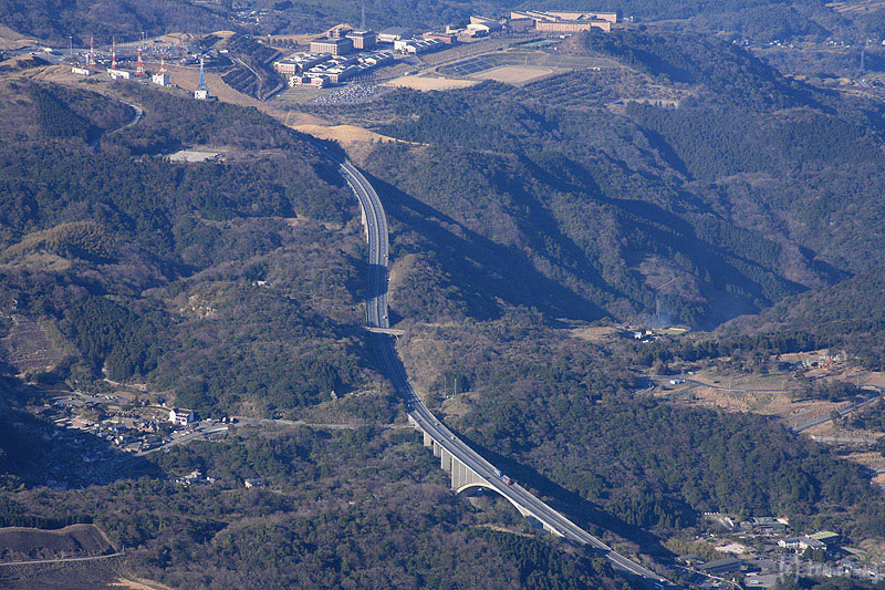 明礬大橋、その上に十文字原展望台とAPU