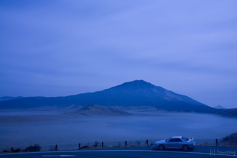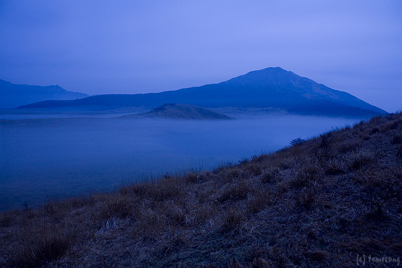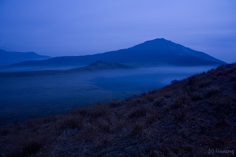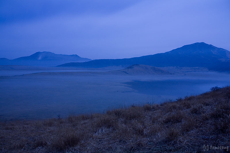 真っ暗でよく見えないけど、草千里のお鉢内に霧が溜まっているように見える。とりあえずバルブ撮影してみた。