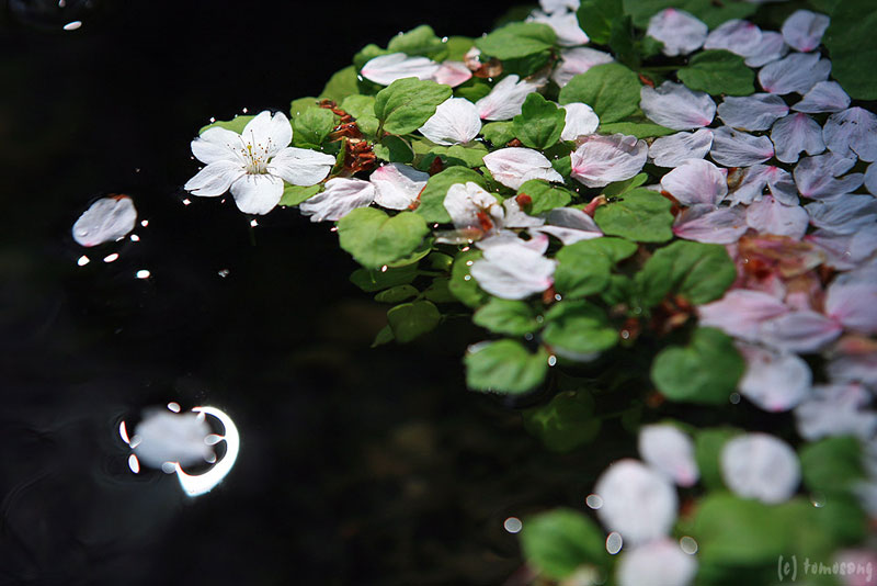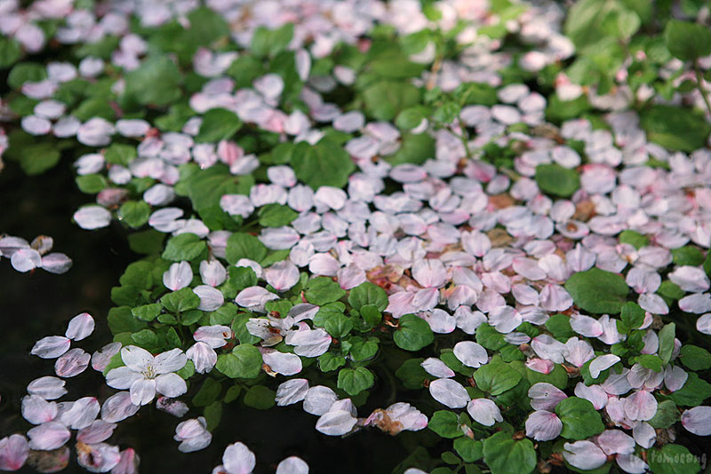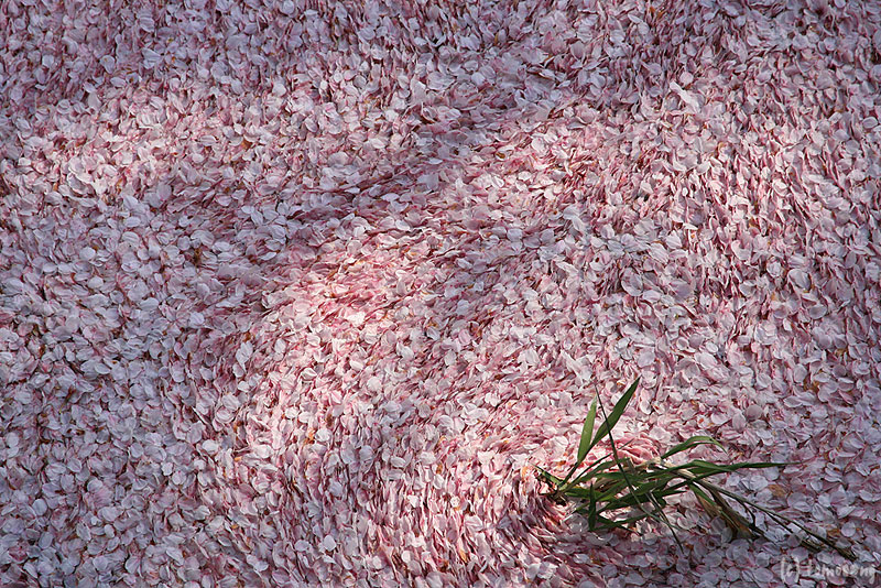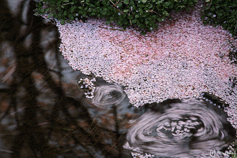 桜の木から舞い落ちた花弁は川へ落ち、水流に乗って下流へ。途中に生える水草で流れが悪くなり、せき止められた花弁が水面に留まることによって一面桜色の絨毯が出来上がっていた。