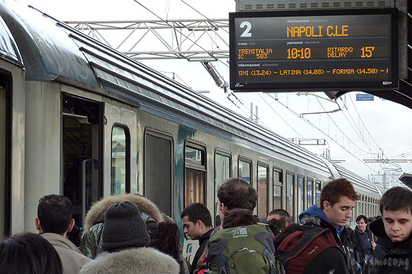 シートが湿っぽい。向かいのおじさんが新聞をシートに広げて座っているのはそのせいか。さらには獣臭がする。もしかしてこの湿り気はばっちいもの?すぐに立ち上がった。新聞を広げているおじさん以外が立ったままブツブツ言っていた理由が理解出来た。徐々に皆が愚痴を言い始めた。イタリア語なので理解出来ないけど。他のコンパートメント内にいる人達は普通にくつろいでいるから、問題があるのはこの区画のみのようだ。そのうちやって来た車掌を捕まえ、何か交渉(当然イタリア語なので内容はわからない)した後、徐々に人が去り始めた。どういう事かわからない自分は我慢して座っていたら、最後の一人が去る時に「他の車両に移動する。君も車掌に頼んで席を変えてもらったら良いよ。」と英語で教えてくれた。あー、Grazie.....でも英語で何て交渉するんだ?結局窓を開け、我慢して留まる。