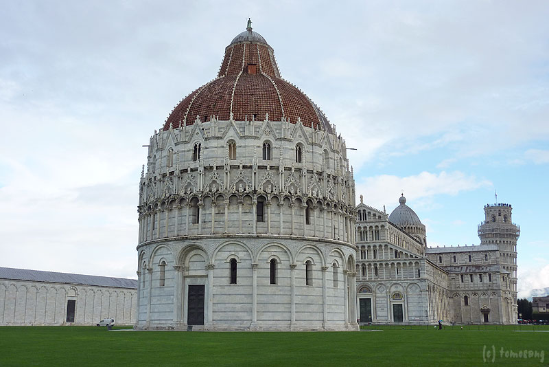 これまで見て来たドゥオモ広場は全て石畳に囲まれて建っていたが、ここは周囲が芝生広場になっている。緑の地面、白い建物、レンガ色の屋根、晴れていれば青い空。美しい!広場として見ればここがベストだ。某SNSで「ピサには斜塔しかない。行かなくても・・・」なんて書き込みを見た時は、あんたは何を見て来たんだ!と突っ込まずにいられなかった。