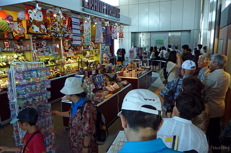 エントランスに入ってビックリ、人の多いこと。休日ということでフロアに居る人はみんな展望室へ行く人。各塔2台のエレベーターがあるというのに、どれだけ人が多かろうと一台しか動かさないみたい。なんで動かさないのかとエレベーター係に質問する人の多いこと。そりゃそうだ、猛暑日にエアコンも入ってないフロアで長時間順番待ちをさせられるわけだから。動かさない理由は「節電」の為らしい。