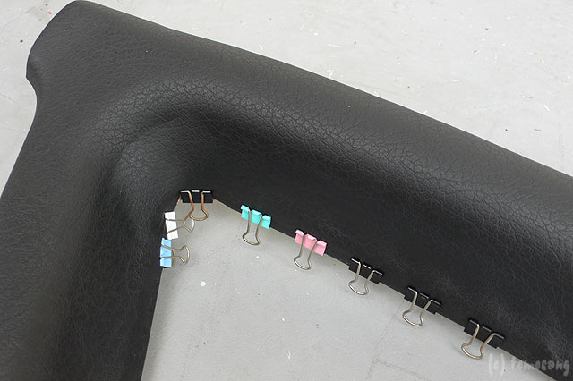 浮きが激しいと、綺麗に貼り付けるのは無理です。引き伸ばしてクリップで固定。クリップが付けられない角部分は気がつくとまた浮いている。
