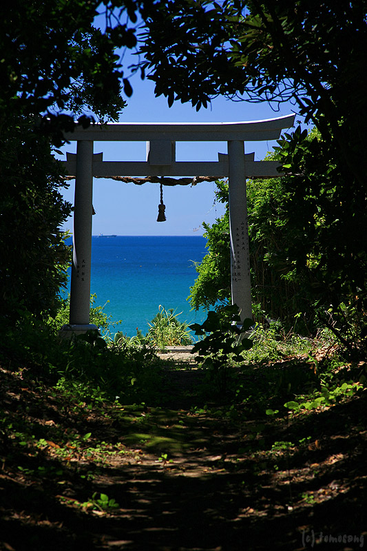 お宮の裏に道が繋がっていて、鳥居を抜けて階段を下ると砂浜に出る。