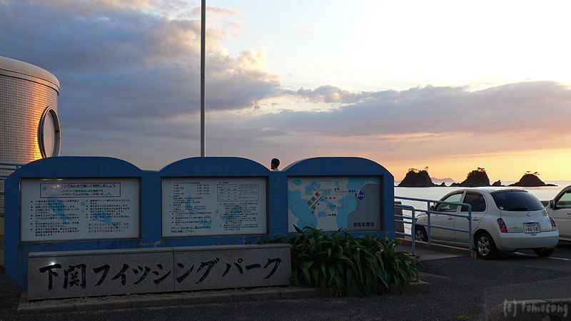 R191を北へ向かって走行中に日が傾く。予定していた場所で夕日を眺めるつもりが、間に合いそうにない。どこかで車を止めて眺めようと、車窓から良さ気な景観を探しながら走行中、絵になりそうなコブ3つが目に入った。夕日が丁度そのコブの背後に落ちるような場所を目指し脇道に入っ行く。到着したのは「下関フィッシングパーク」