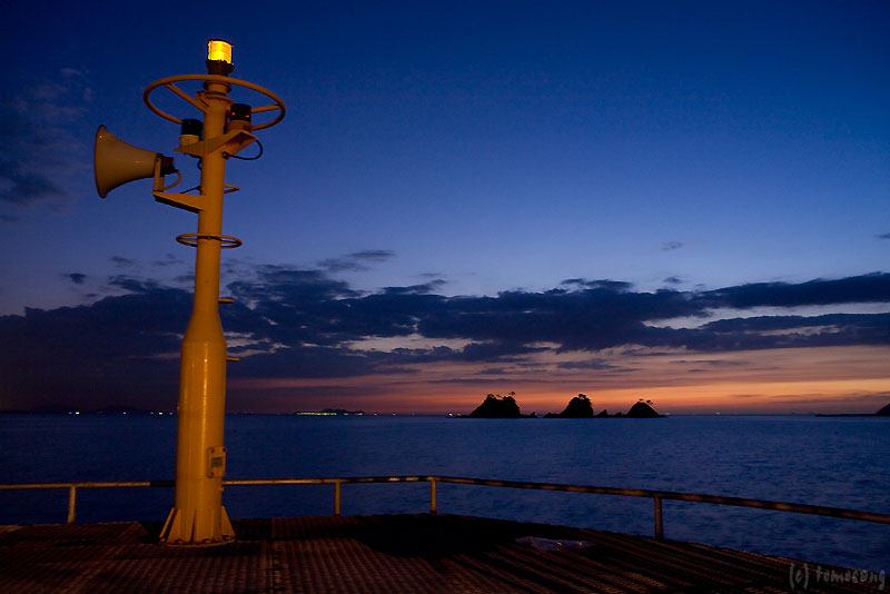 この施設、フィッシングパークなので釣客用に桟橋が海に突き出ている。その先まで行けば丁度良い角度で眺められそうだが、入場するのに入場料が必要なので迷う。料金表を見ると「拝観料200円」という項目があり、釣りをしないなら安く中へ入れる事に気が付いた。桟橋内では三脚の使用は禁止という条件を飲めば中に入れてくれるらしい。桟橋から眺めることに決めた!