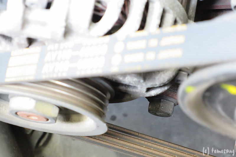 ■オルタネーター本体が下側ボルトを軸に動くようになるので、ベルトをプーリーから外す。