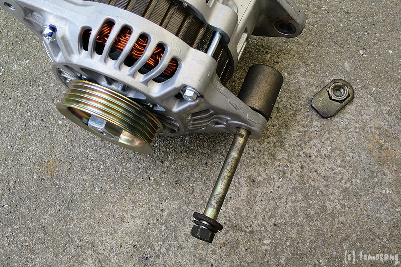 もしかしたらこの時点でオルタネーター本体が落ちてくるかもしれないので、片手で本体を支えておく。一度も交換していないのであれば固着していて外れないと思う。上からバールでこじって落下させた。プーリーに傷が入ったが、コア返却に際して傷を入れるなとは書いてなかったので問題ないなかろう。