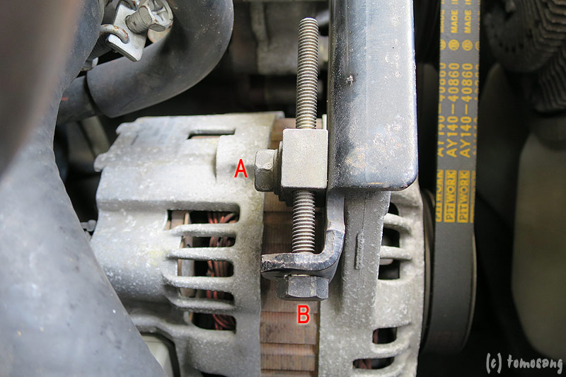 ■ベルトをプーリーにかけた後、ボルトAが取り付けにくくなる。ボルトBを緩めて取り付けた後、ボルトBでベルトの張り具合を調整。ボルトAをや下側のボルトを先に締め付けてしまわぬよう注意。