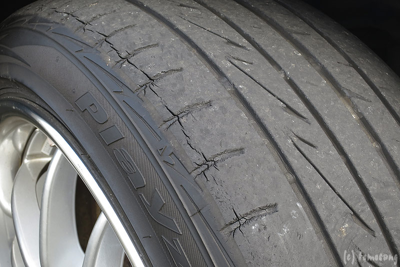 溝だけならもう少し頑張れそうで、どうせ乗らないから車検まで粘るつもりだった。でも、ゴムが傷んでます(タイヤワックスは塗ってません)。