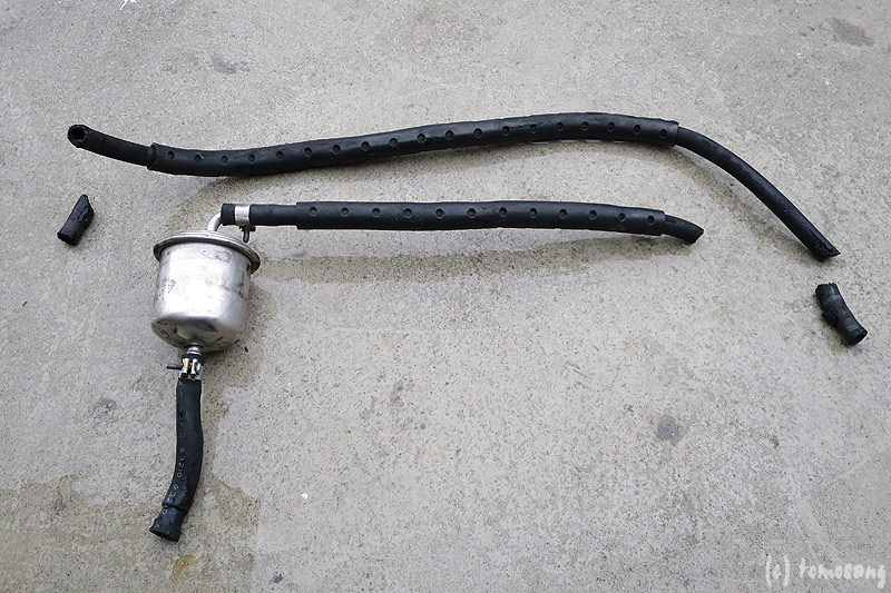 ついでだから他の燃料ホースも換えてやるかと。メートル単位パクると棚卸しでばれないか?と思い、部品課に相談して売ってもらった。原価(会社の仕入れ値)はメートルあたり二百数十円ということです。さすがに原価では売ってくれませんでしたけど、ディーラーはもちろん、通販で購入するより遥かに安い値で手に入りました。