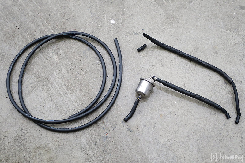 燃料ホースは場所ごとに部品として用意されておらず。測り売りは行っていないので、長いホースを購入して必要分だけ使ってくださいということだ。窓口の方の記憶によると3mくらいで6,000円ぐらいではなかったですかね、と。。。FASTで検索したのではなく立ち話なので正確ではない。