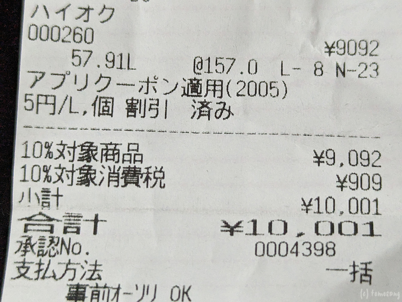 給油時も単価157のモニター表示を見て少し下がったねと思いながら入れたら請求が壱万円。その時は給油量がいつもより多いからと気にせずいたけど、こんなカラクリで安く見せていたとは。