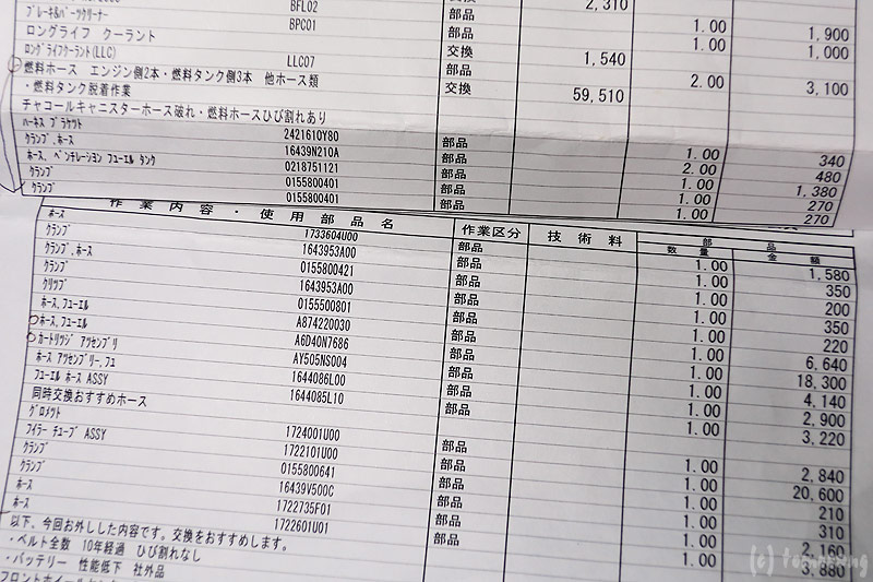 ということで、工賃変わらず、部品代39,920円となり、請求は見積から3万円程下がりました。