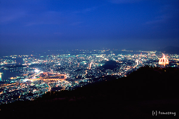 ケーブルカーや車で頂上手前まで登ることができ、山頂からは北九州市街の夜景をパノラマで見渡すことができます。