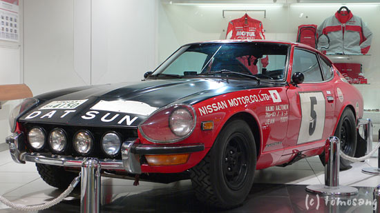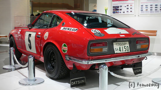 昭和47年(1972)1月に行われた第41回モンテカルロラリーで総合3位に入った5号車、R・アルトーネン/J・トッド組のマシンです。雪と氷のモンテカルロラリーと称されるこのラリー。コントロールのむずかしいFR車が3位に入ったことに、世界中のラリー関係者が驚き、注目しました。前年のサファリラリー優勝に続く快挙で、国内でもZのラリー車が増えました。
