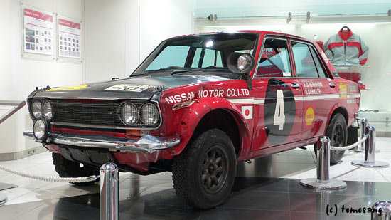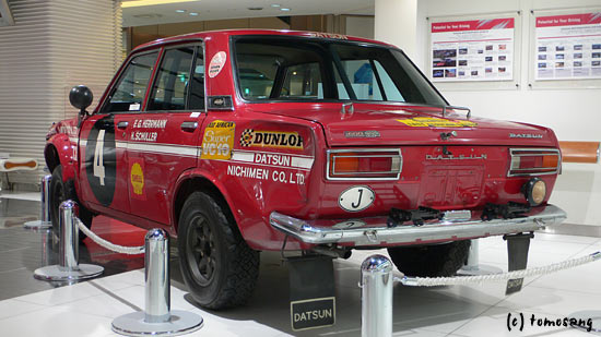 昭和45年(1970)の第18回東アフリカサファリラリーで総合優勝を果たしたマシンです。昭和38年の初参加から8年目、総合・クラス・チーム優勝の完全制覇でした。3代目ブルーバード(510)のデビューは昭和42年(1967)8月。'69年・第17回サファリラリーを舞台にした映画「栄光の5000キロ」(石原裕次郎主演)は有名です。
