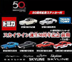 パッケージに日産自動車公式の「スカイライン50周年記念マーク」を冠し、「記念ステッカー」を封入した「スカイライン」×「トミカ」のアニバーサリースペシャルコラボ商品です。トミカが過去に発売してきた歴代スカイラインを、「前期」と「後期」に分けて、全車種商品化の予定。