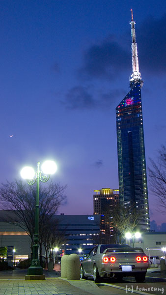 イルミネーション点灯開始は18時からですが、周りが明るいのでイルミが浮かんでこない。かといって空が完全に暗くなると絵として綺麗じゃない(「福岡タワー『ハートのイルミネーション』」参照)。撮影に適した時間は点灯開始から約20分程後。綺麗に撮影できる時間というのは10~15分しかありません。