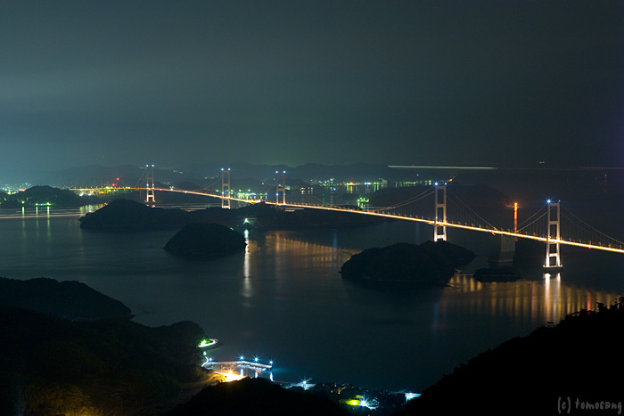 西瀬戸自動車道(通称:瀬戸内しまなみ海道)と山陽自動車道は繋がっていない為、福山西ICで一度一般道に下ります。ついでなので、食事を調達しようとコンビニを探すけど尾道バイパス沿いには全く無い。しまなみ海道への分岐点を通過して探し続けるけど店自体が一軒も無い。「市街地」の方向に行けばあるだろうと、道路標識を頼りにバイパスを反れ、気が付けば新幹線の新尾道駅付近に。そこをさらに通過した所で一軒の7-11を発見。晩飯用弁当と朝飯用パン&コーヒーをゲット!来た道を戻り、やっとしまなみ海道突入。